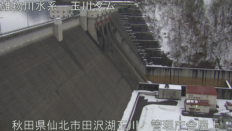 玉川ダム管理庁舎屋上ライブカメラは、秋田県仙北市田沢湖玉川の玉川ダム管理所屋上(玉川ダム管理庁舎屋上)に設置された玉川ダム・宝仙湖(ダム湖)・玉川・玉川発電所・玉川ダム下流公園付近・玉川ダム資料館付近・カリヨンの鐘付近が見えるライブカメラです。独自配信による静止画のライブ配信映像です。国土交通省による配信。