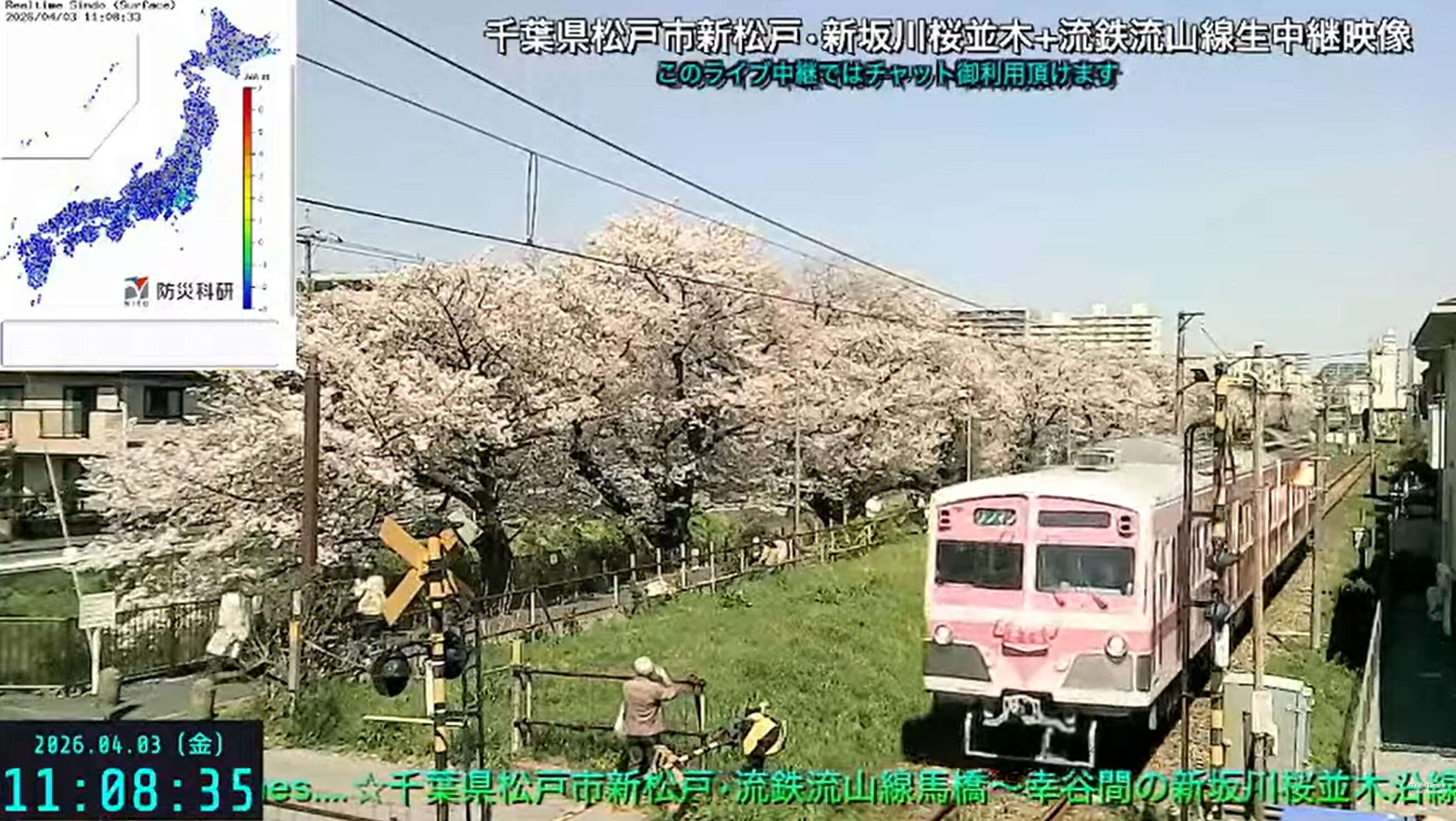 トレインタイムス流鉄流山線ライブカメラは、千葉県松戸市新松戸の押出橋付近に設置された流鉄流山線(馬橋駅〜幸谷駅間)・流山線列車・新坂川・桜並木(桜通)・新坂川緑道が見えるライブカメラです。更新はリアルタイムで、YouTubeによる動画(生中継)のライブ配信映像です。トレインタイムスチャンネルによる配信。