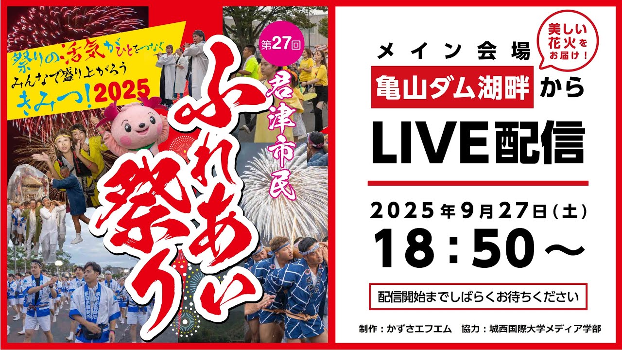 ライブカメラ https://www.youtube.com/watch?v=M06a8IxzlRo YouTube公式チャンネル https://www.youtube.com/@citykimitsu 君津市民ふれあい祭り亀山湖花火大会 |
