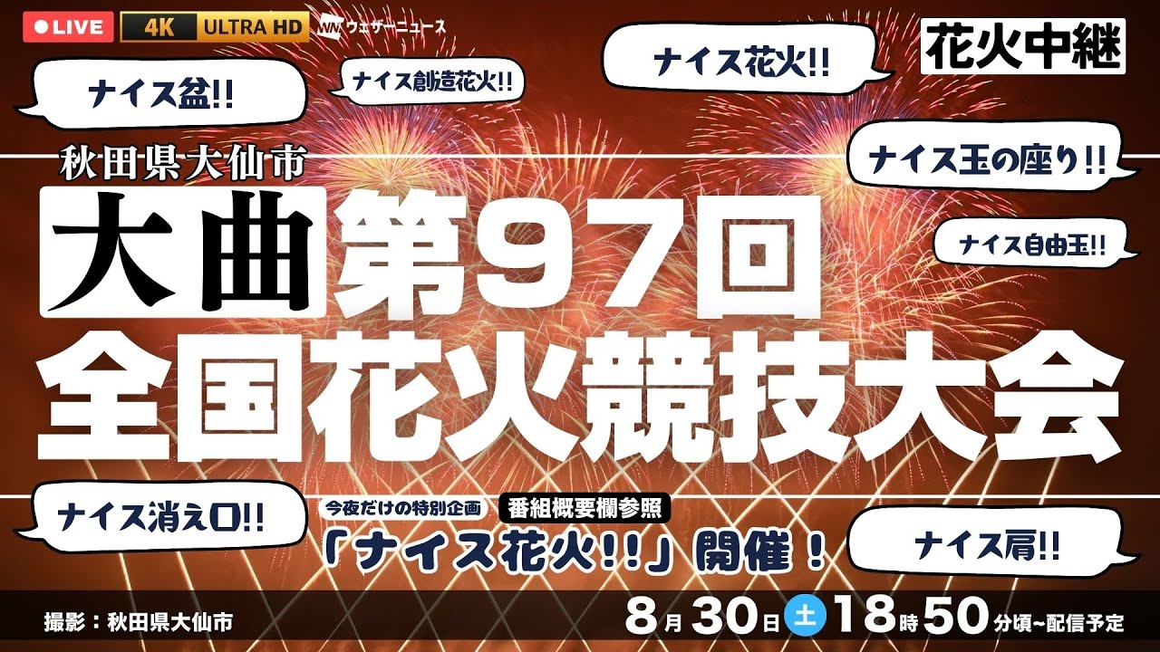 ライブカメラ https://www.youtube.com/watch?v=WJt-lftBpBQ YouTube公式チャンネル https://www.youtube.com/@weathernews 全国花火競技大会 大曲の花火(大曲花火) https://www.oomagari-hanabi.com/ ウェザーニュース |