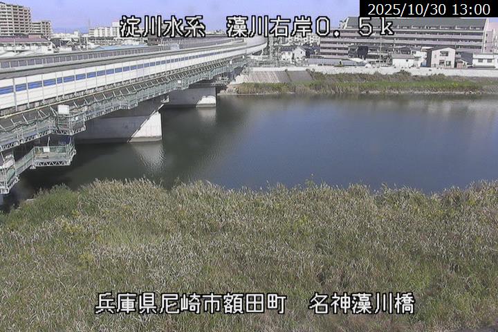 藻川名神藻川橋ライブカメラは、兵庫県尼崎市東園田町の名神藻川橋に設置された藻川・猪名川藻川合流地点付近・藻川橋・園田高架橋・名神高速道路・高田中継ポンプ場付近・尼崎市立園田東小学校付近が見えるライブカメラです。独自配信による静止画のライブ配信映像です。国土交通省による配信。