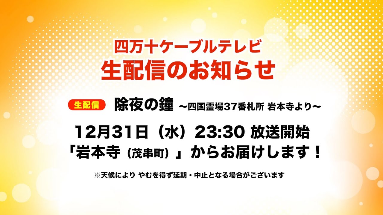 ライブカメラ https://www.youtube.com/watch?v=9qZZzzoG2m4 YouTube公式チャンネル https://www.youtube.com/@40010tv 岩本寺 四万十ケーブルテレビ |