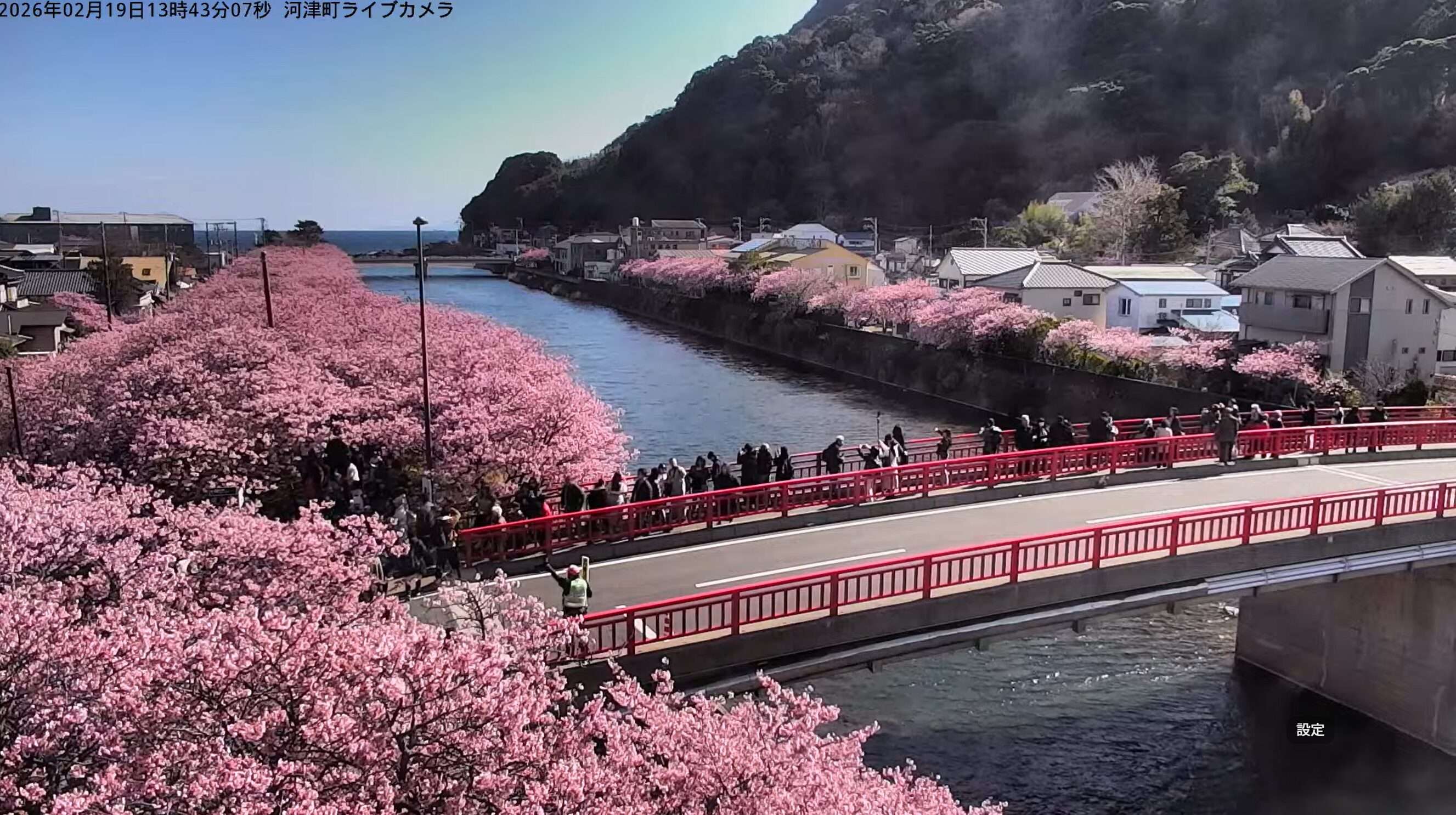 河津桜河津川桜並木ライブカメラは、静岡県河津町浜の舘橋付近に設置された河津桜まつり・河津川・河津桜並木(河津川桜並木)・伊豆急行伊豆急行線(河津駅~稲梓駅間)・舘橋・荒倉橋が見えるライブカメラです。更新はリアルタイムで、YouTubeによる動画(生中継)のライブ配信映像です。河津町役場(河津町ライブカメラ)による配信。