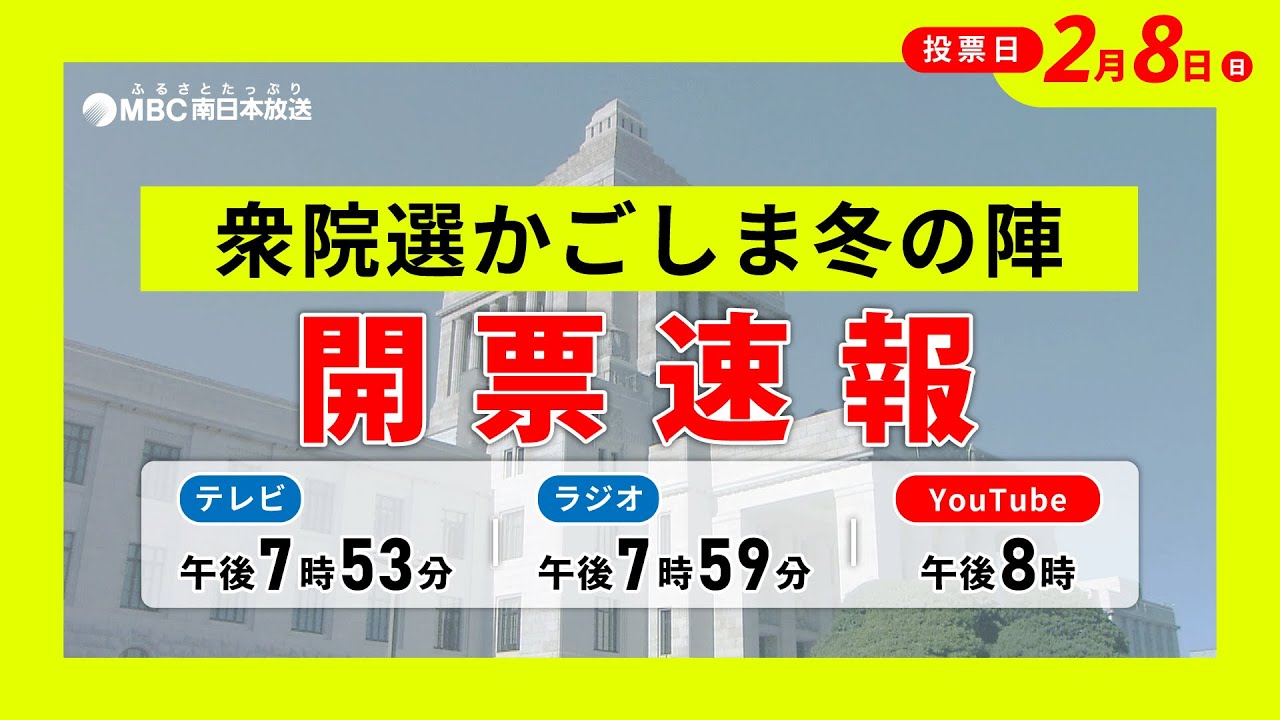 MBC衆議院議員総選挙開票速報ライブカメラは、鹿児島県鹿児島市高麗町の南日本放送に設置された衆議院議員総選挙開票速報が見えるライブカメラです。更新はリアルタイムで、YouTubeによる動画(生中継)のライブ配信映像です。南日本放送による配信。