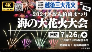 花火大会 NCTぎおん柏崎まつり海の大花火大会ライブカメラ(新潟県柏崎市東港町) NCTぎおん柏崎まつり海の大花火大会ライブカメラは、新潟県柏崎市西港町のみなとまち海浜公園及び中央海岸一帯に設置されたぎおん柏崎まつり海の大花火大会(越後三大花火)が見えるライブカメラです。更新はリアルタイムで、YouTubeによる動画(生中継)のライブ配信映像です。エヌ・シィ・ティ(NCT)による配信。 花火大会