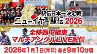 駅伝 ニューイヤー駅伝全移動車ライブカメラ(群馬県) ニューイヤー駅伝全移動車ライブカメラは、群馬県のニューイヤー駅伝区間100km(1区~6区)に設置されたニューイヤー駅伝(全日本実業団対抗駅伝競走大会)全移動車・スタート地点・各中継所・区間賞インタビュー・フィニッシュ地点が見えるライブカメラです。更新はリアルタイムで、YouTubeによる動画(生中継)のライブ配信映像です。TBS陸上ちゃんねるによる配信。 駅伝
