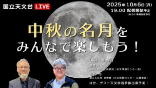 中秋の名月 国立天文台中秋の名月ライブカメラ(東京都三鷹市大沢) 国立天文台中秋の名月ライブカメラは、東京都三鷹市大沢の国立天文台三鷹キャンパスに設置された中秋の名月が見えるライブカメラです。更新はリアルタイムで、YouTubeによる動画(生中継)のライブ配信映像です。国立天文台による配信。 中秋の名月
