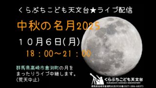 中秋の名月 くらぶちこども天文台中秋の名月ライブカメラ(群馬県高崎市倉渕町水沼) くらぶちこども天文台中秋の名月ライブカメラは、群馬県高崎市倉渕町水沼のくらぶちこども天文台に設置された中秋の名月が見えるライブカメラです。更新はリアルタイムで、YouTubeによる動画(生中継)のライブ配信映像です。くらぶちこども天文台による配信。 中秋の名月