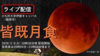 皆既月食 九州大学地学研究部気象班月食ライブカメラ(福岡県福岡市西区元岡) 九州大学地学研究部気象班月食ライブカメラは、福岡県福岡市西区元岡の九州大学伊都キャンパスに設置された皆既月食・部分月食が見えるライブカメラです。更新はリアルタイムで、YouTubeによる動画(生中継)のライブ配信映像です。九州大学地学研究部気象班による配信。 皆既月食