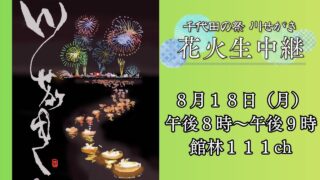 花火大会 千代田の祭川せがき打ち上げ花火ライブカメラ(群馬県千代田町赤岩) 千代田の祭川せがき打ち上げ花火ライブカメラは、群馬県千代田町赤岩の利根川河畔(赤岩渡船場付近)に設置された千代田の祭川せがき打ち上げ花火が見えるライブカメラです。更新はリアルタイムで、YouTubeによる動画(生中継)のライブ配信映像です。ケーブルテレビ館林(きゅーちゃんねる)による配信。 花火大会