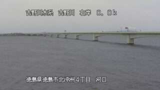 徳島県徳島市 吉野川河口ライブカメラ(徳島県徳島市北沖洲) 吉野川河口ライブカメラは、徳島県徳島市北沖洲の臨港道路沖洲(外)線沿いに設置された吉野川河口・吉野川サンライズ大橋(吉野川大橋)・徳島南部自動車道(徳島南部道)・小松海岸緑地が見えるライブカメラです。独自配信による静止画のライブ配信映像です。国土交通省による配信。 徳島県徳島市