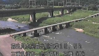 三重県津市 雲出川石橋ライブカメラ(三重県津市一志町) 雲出川石橋ライブカメラは、三重県津市一志町の大仰水位観測所に設置された雲出川・石橋の潜水橋(雲出川八景)・近畿日本鉄道大阪線(伊勢石橋駅~川合高岡駅)が見えるライブカメラです。更新は10分間隔で、独自配信による静止画のライブ配信映像です。三重河川国道事務所による配信。 三重県津市