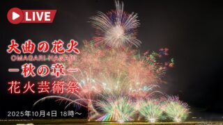 花火大会 JapanVideography大曲の花火秋の章ライブカメラ(秋田県大仙市大曲船場町) JapanVideography大曲の花火秋の章ライブカメラは、秋田県大仙市大曲船場町の大曲の花火公園に設置された大曲の花火秋の章(大曲花火芸術祭)が見えるライブカメラです。更新はリアルタイムで、YouTubeによる動画(生中継)のライブ配信映像です。Japan Videographyによる配信。 花火大会
