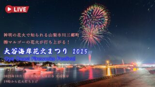 JapanVideography大谷海岸花火まつりライブカメラは、宮城県気仙沼市本吉町三島の道の駅大谷海岸に設置された大谷海岸花火まつりが見えるライブカメラです。更新はリアルタイムで、YouTubeによる動画(生中継)のライブ配信映像です。Japan Videographyによる配信。