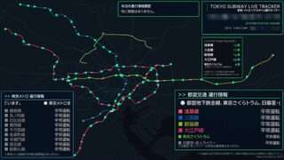 東京都 東京地下鉄運行モニターライブカメラ(東京都内) 東京地下鉄運行モニターライブカメラは、東京都内に設置された都営交通運行情報(浅草線・三田線・新宿線・大江戸線・東京さくらトラム・日暮里舎人ライナー)・東京メトロ運行情報(銀座線・丸ノ内線・日比谷線・東西線・千代田線・有楽町線・半蔵門線・南北線・副都心線)・運行情報履歴が見えるライブカメラです。更新はリアルタイムで、YouTubeによる動画(生中継)のライブ配信映像です。東京地下鉄運行モニター(非公式)による配信。 東京都