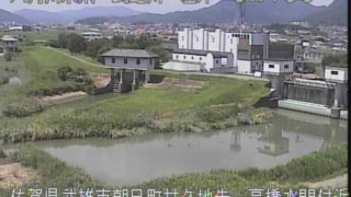 佐賀県武雄市 武雄川高橋水門ライブカメラ(佐賀県武雄市朝日町) 武雄川高橋水門ライブカメラは、佐賀県武雄市朝日町の高橋水門に設置された武雄川・武雄川高橋川合流地点・武雄川甘久川合流地点・武雄河川事務所朝日出張所・高橋排水機場・高橋自然観察園・JR高橋駅付近(佐世保線)が見えるライブカメラです。更新は3分間隔で、独自配信による静止画のライブ映像配信です。武雄河川事務所による配信。 佐賀県武雄市