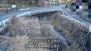 群馬県桐生市 沢入川上田沢ライブカメラ(群馬県桐生市黒保根町上田沢)1.2 沢入川上田沢ライブカメラは、群馬県桐生市黒保根町上田沢に設置された沢入川・新観音橋・いぼ石・彫物師関口文治郎の墓・不動明王の石造付近が見えるライブカメラです。独自配信による静止画のライブ配信映像です。国土交通省による配信。 群馬県桐生市