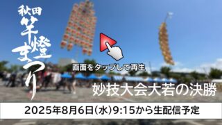 秋田県秋田市 秋田竿燈まつり妙技会ライブカメラ(秋田県秋田市中通) 秋田竿燈まつり妙技会ライブカメラは、秋田県秋田市中通の竿燈妙技会場(エリアなかいちにぎわい広場)に設置された秋田竿燈まつり妙技会が見えるライブカメラです。更新はリアルタイムで、YouTubeによる動画(生中継)のライブ配信映像です。秋田ケーブルテレビ(CNA)による配信。 秋田県秋田市