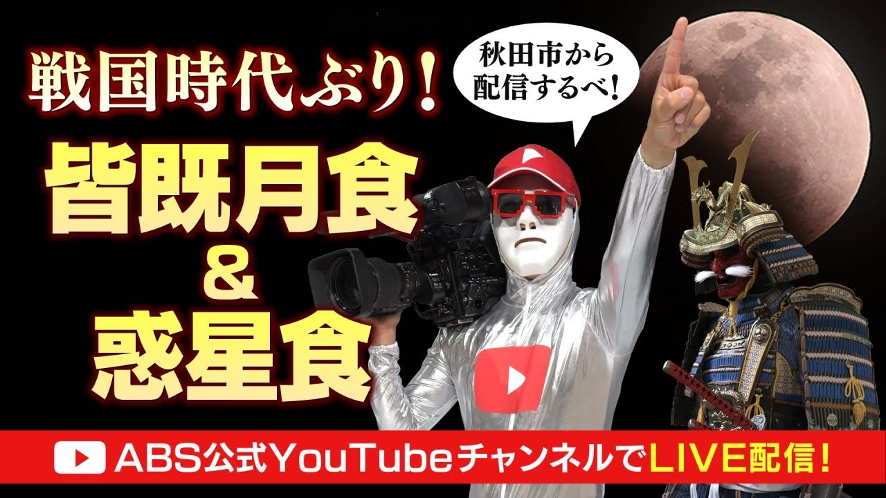 秋田放送皆既月食ライブカメラは、秋田県秋田市中通の秋田放送に設置された皆既月食・部分月食が見えるライブカメラです。更新はリアルタイムで、YouTubeによる動画(生中継)のライブ配信映像です。秋田放送(ABS)による配信。