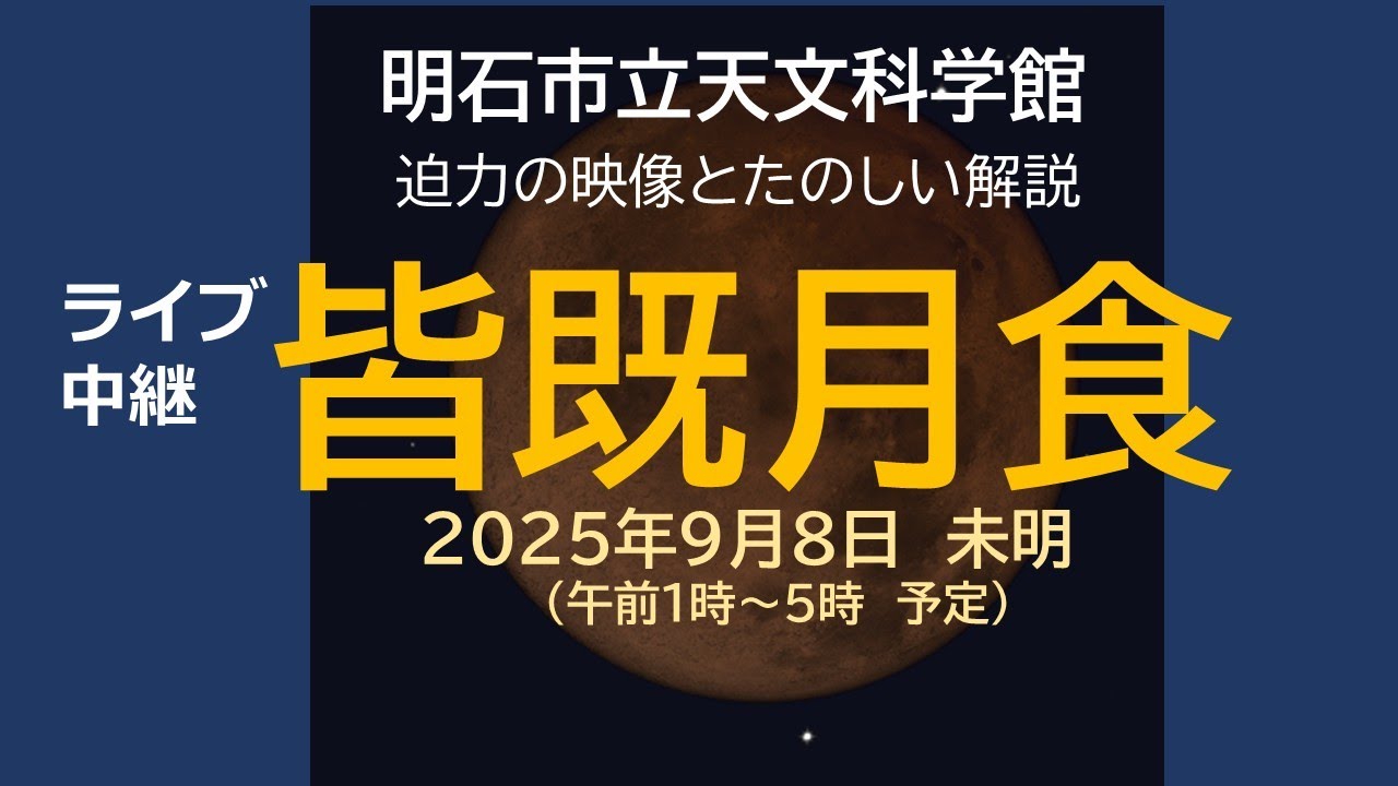 明石市立天文科学館皆既月食ライブカメラは、兵庫県明石市人丸町の明石市立天文科学館に設置された皆既月食・部分月食が見えるライブカメラです。更新はリアルタイムで、YouTubeによる動画(生中継)のライブ配信映像です。明石市立天文科学館による配信。