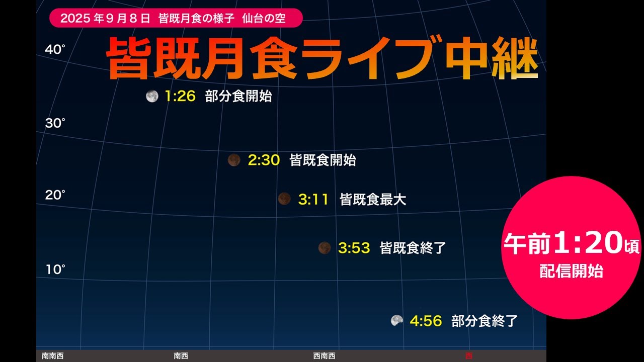 仙台市天文台月食ライブカメラは、宮城県仙台市青葉区の仙台市天文台に設置された皆既月食・部分月食が見えるライブカメラです。更新はリアルタイムで、YouTubeによる動画(生中継)のライブ配信映像です。仙台市天文台による配信。