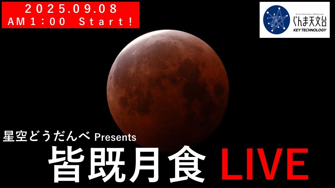 県立ぐんま天文台皆既月食ライブカメラは、群馬県高山村中山の県立ぐんま天文台に設置された皆既月食・部分月食が見えるライブカメラです。更新はリアルタイムで、YouTubeによる動画(生中継)のライブ配信映像です。県立ぐんま天文台による配信。